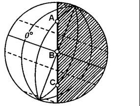 4、综合题 “地球光照图”(阴影表示黑夜,非阴影表示白天),回答下列问题: