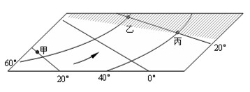 图中箭头为地球自转方向,阴影为黑夜,此时在丙地正好可以看到日落的景观,读图完成1—2题。