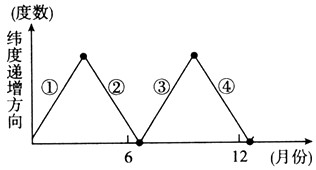 5、单选题 日照图中,晨线圈上有两个晨线与昏线的分界点。位于北半球的分界点设为H,位于南半球的分界点设为K。下图中的折线表示K点在一年中的纬度变化状况。读图完成1~2题。