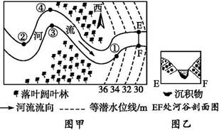 【小题1】结合图乙中E岸堆积(即左岸),F岸侵蚀(即右岸)判断,可推知图甲中地区位于北半球,由图甲地处大陆东岸,植被为落叶阔叶林知,该地为温带季风气候(或温带大陆性气候)分布区,图乙中地质构造为背斜,离河岸越远,岩石年龄越新,A错;根据指向标及河流流向可判断地势南高北低,B错;④处为凹岸以侵蚀为主,②③为凸岸以堆积为主,C对;④处侵蚀作用强,水深利于建港,D错。