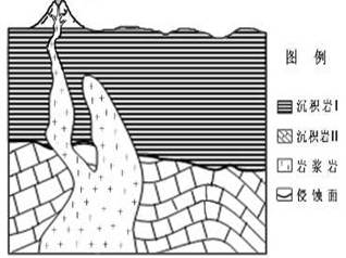 本题解析:由图示可以看出沉积II比沉积I老,岩浆岩是最后形成的。而沉积II上部岩层明显有外力侵蚀过程,该地岩层形成过程应是:沉积作用(沉积岩II)-水平挤压(形成褶皱)-侵蚀作用(沉积II顶部被侵蚀)-沉积作用(沉积岩I)-岩浆活动。选A正确。