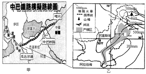 材料一?中巴铁路模拟路线图和巴基斯坦降水量及主要棉花分布图, 回答问题。