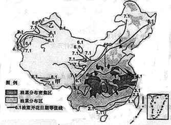油莱是我国重要的油料作物,分布广泛。下图示意我国油莱分布及开花日期等值线分布。