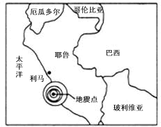 4、单选题 如图所示,当地时间2010年2月27日凌晨3时34分,距圣地亚哥西南340km处发生里氏8.8级强烈地震。读下列材料,回答下列各题。