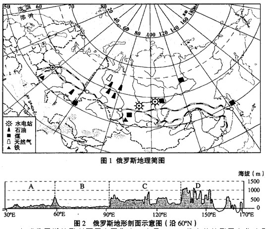1、综合题 读俄罗斯地理简图及地形剖面图,回答问题。