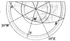 (1) 此图所示日期为__________,此时太阳直射点的经度是_________。此时与北京日期相同的地区范围是___________________________。若一架飞机由A地飞到B地,其