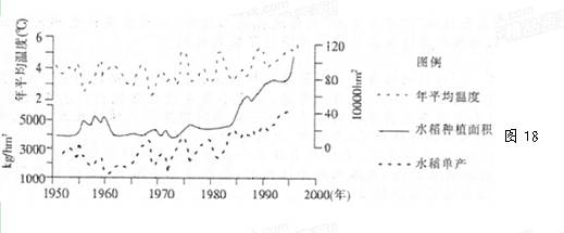 材料二?图18为“1951—1997年该地区年平均温度、水稻种植面积及单产的变化图”。