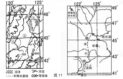 材料一?我国东北地区某区域图及“北水南调”工程规划示意图(图17)