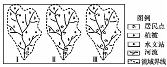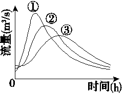 1.该流域开发过程中2.假设该流域三个阶段都经历了相同的一次暴雨过程,在P处形成的流量变化过程与图中①②③分别对应的是
