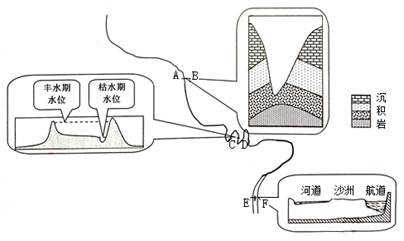 (3)EF截面所在河段的航道靠近 (E、F)岸,说明判断依据。(3分)