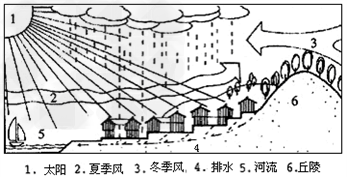 1、单选题 下图表示我国某乡村聚落地理环境示意图。据此回答1 、2 题。