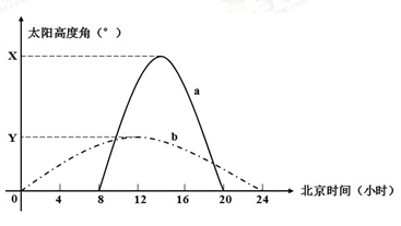 3、单选题 下图为a和b两地同一日期太阳高度日变化示意图,X、Y分别为两地该日最大太阳高度,据此回答下列小题。