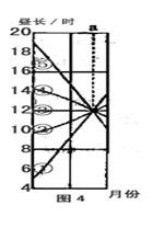 2、单选题  图4各线示意不同纬度①~⑤地的白昼长度变化。读图,回答7~8题。