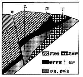 【小题2】图示地区中甲是断层,断层容易渗出地下水,是地下水补给,不是储油构造,A错。丙处钻井在花岗岩与沉积岩接触部位,可能发现变质岩,B对。乙处钻井穿过岩层比丙少,岩层不是最复杂,C错。图中显示,铁矿带被切断,所以先形成铁矿,后发生断层,D错。