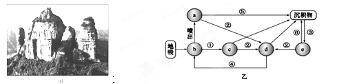 4、单选题 2010年8月,“中国丹霞”被正式列入《世界遗产名录》。甲图为广东丹霞山地貌景观,图示山体主要是由红色砂砾岩构成。乙图为地质循环示意图。读图回答下列问题。