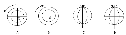 本题解析:俯视图中北半球地球自转方向为逆时针,南半球自转方向为顺时针,所以A、B图正确;地球自西向东自转,所以C图正确,D图错误。