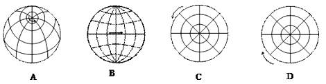 【小题2】若在纬线b为一年内最大纬度时,某人在O点上空对着地心的方向观察地球,此人所见的经纬网可能为下图中的(    )