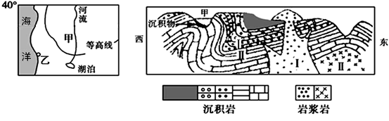 2、单选题 下图中的左图示意世界某区域(40°为纬度),右图示意左图中甲地区及其周边地区的地质剖面,甲地河谷剖面的形成主要与地转偏向力的作用有关,读图回答以下问题。