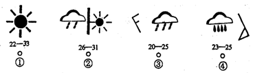本题解析:此题主要考查天气符号示意图,难度较小。①表示天气晴朗,白天对太阳辐射削弱少气温高,夜间保温作用弱气温低,气温日较差大;②表示中雨转晴,白天对太阳辐射削弱强气温低,夜间保温作用强气温高,气温日较差小;③表示大雨,西北风三级,该城市不会出现狂风暴雨天气;④表示暴雨,东南风八级,最低气温23℃,最高气温25℃,该城市不会出现冰雹灾害性天气。因此A选项说法正确。