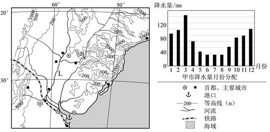 (1)因甲城市位于中低纬地区,夏季高温,冬季温和,从降水分布图分析,夏季多雨,冬季少雨,降水的年变化大。