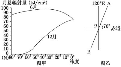 4、单选题 低碳经济时代,太阳能的利用方兴未艾。下面图甲为“北半球海平面6月和12月太阳月总辐射量随纬度变化示意图”,图乙为“晨昏线示意图”。读图完成小题。