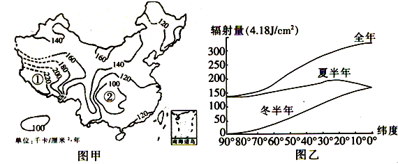 2、综合题 图甲为我国年太阳辐射总量分布图,图乙为地球表面各纬度的全年和冬、夏半年辐射总量图。读图,回答下列问题。(26分)