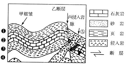 3、单选题 下图为某处地层未曾倒置的地质剖面图,其中①至④代表所在地层的成岩作用,据此完成下题。