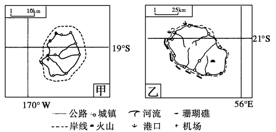小题4:甲、乙两岛中,公路密度较低的是(?)岛,导致该岛公路密度较低的主要自然原因是(?)。(4分)