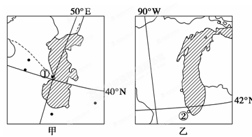 小题1:图示甲表示里海,有丰富的石油资源;乙图表示美国东北部五大湖地区,有丰富的铁矿资源。