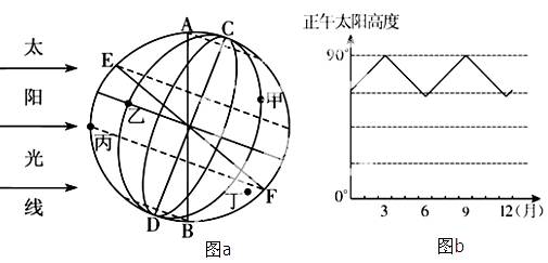 (5)读图b可知,图中3月和9月有两次正午太阳高度为90°,说明该地位于赤道,图a中乙地位于赤道。