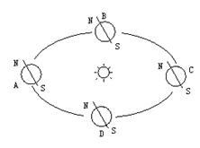 (3)当太阳直射北回归线时,地球位于 点;当太阳直射南回归线时,地球位于