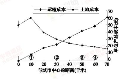 2、单选题  读“某工业部门在某城市及其附近地区运输成本和土地成本的变化曲线图”,回答下列各题。