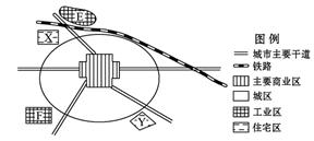 2、单选题 该图是我省某中等城市功能区分布示意图。读图回答问题。