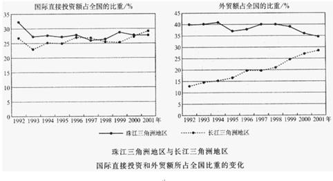 3、单选题 读“珠江三三角洲与长江三角洲地区国际直接投资和外贸额所占全国比重的变化图”,回答问题: