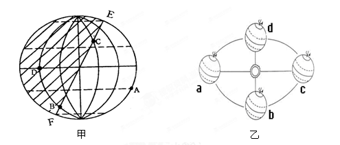 中阴影部分表示黑夜,乙为地球绕日公转示意图,回答(10分)