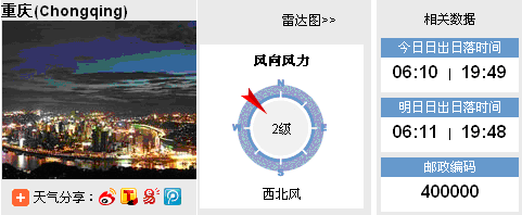 4、单选题 下图截取自2014年某日中国天气网中重庆市(29.5°N ,105.5°E)天气预报的网页。回答下题。