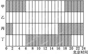 1、单选题 下图为“甲、乙、丙、丁四地12月某日昼夜分布示意图”,阴影表示黑夜。读后回答题。