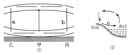 1.关于图①中的判断正确的是2.图②所示的海陆热力环流现象通常出现在3.如果图②位于南亚,则C的盛行风向为