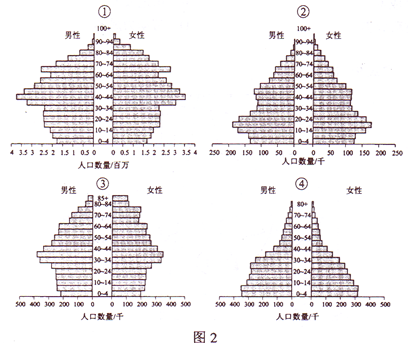 3、单选题 图2示意4个国家人口的性别一年龄构成。读图2.完成3~4题。