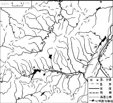 4、综合题  下图为我国亚热带季风气候区某省P县(图中面积最大者)城镇和水系分布示意图。P县境内最高海拔为1050米,最低海拔为24米。据此回答下列问题。(30分)