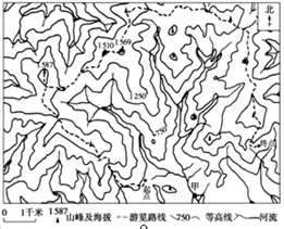 1、单选题 读下侧某地等高线示意图(单位:米),回答下列问题。
