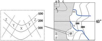 5、单选题 下图为“世界某区域图”,右图实线为等高线(单位:米),虚线a、b、c为等压线,箭头表示P地的风向;左图为甲区域的放大图,实线为等高线(单位:米),虚线为地层界线,X、Y、Z为不同地层。读图完成下列各题。