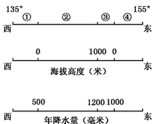 1、单选题  ? 读35°S附近某地区的相关数据图,其中①、④处为海洋,②、③处为陆地,135°、155°为当地的经度,回答第1—3题。