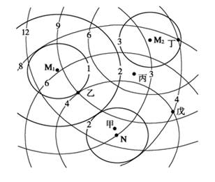 小题2:某企业生产必需的两种原料分别来源于M1、M2,N是该企业的唯一市场,以M1、M2为圆心的同心圆分别代表生产单位产品所需两种原料的等运费线,以N为圆心的同心圆代表单位产品的等运费线,如果仅考虑运费因素,下列四个地点建厂最合适的是