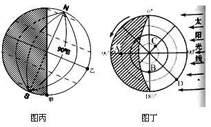 (6)图丙和图丁为太阳光照图,斜线(阴影)部分表示夜半球,空白部分表示昼半球,图丙所示日期与图乙中的      点一致,图丁所示日期为