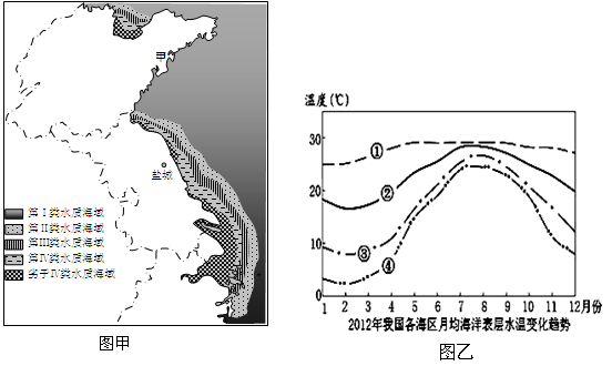 3、综合题 图甲为2012年我国近海部分海域水质分布状况,图乙为我国四大海区月均海洋表层水温变化状况。读图完成下列各题。(12分)
