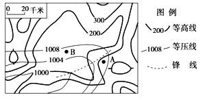 小题1:读图,根据等压线数值判断,此时A处是一低压槽影响,锋面气旋右侧应是暖锋,A在暖锋的锋后。暖锋降水在锋前,从地形角度看,A处是山脊地形,不是集水区,①错。②对。暖锋锋后是暖气团控制,气压将下降,③错。北半球气旋是逆时针辐合,A处吹偏南风,④对。所以B对。