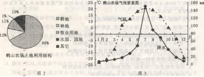 5、单选题 ?图2、图3为鹤山农场土地利用情况和气候要素图.该农场处于小兴安岭向松嫩平原过渡的地带,坡长而缓,耕地坡度多在10°~40°之间。据此完成3—4题。