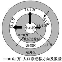 小题2:城市化初级阶段农村人口迁入城市中心区;城市“空心化”现象是逆城市化的表现,人口由城市迁向农村或其他城市,材料仅反映城市内各圈层的人口迁移,不能判断为逆城市化。也无法判断城市人口规模的变化,近郊区人口净迁入量最大,故可判断为郊区城市化。