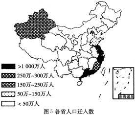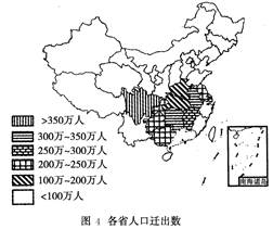 2、单选题 根据国家农调总队的抽样调查,中国每3个产业工人中就有2个来自农村地区。2007年到乡镇企业就业和外出务工的农民有2.26亿。读图4“各省人口迁出数”和图5“各省人口迁入数”,完成10~11题。